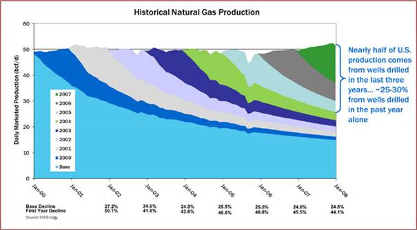 Figure 2. Historical gas production in the U.S. showing the percentage of production from vintage of well (modified from Chesapeake April 2009 Investor presentation from original data of HIS Energy)