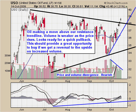 The Crude Oil ETF has broken above its resistance trend line this week but still struggling to move above the August high. Volume is declining while the price rises which is a bearish indicator. USO looks ready for some type of a pullback as it digests this breakout before moving higher.