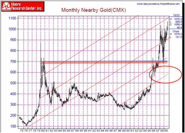 The long term view of Gold shows that as $4 dollars is to corn, and $40 dollars is to gold, the chart above suggests that the $700 dollar area is most probably the PIVOT point for gold. We can see that although 1980 did have a spike to $875, the chart reveals that 700 (or just slightly above it) was where the price rise was really contained. The 2006 high was also at 700 and spent almost a year and a half bouncing off that area before it blasted thru to 1000. Finally, the subsequent 2008 meltdown low was right at the $700 dollar area. We think the weight of the evidence suggests that $700 is indeed the new pivot.