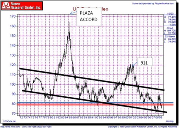 The U.S. Dollar's pivot point seems to be the 80 area. As you can see, it always provided a support area until interest rates fell to almost zero in order to try and restimulate the U.S. economy over the last few years. Overall however, we can see that the dollar has a down trending channel that it is following long term. We can see that while gold and crude are making their way to the next upper trend line, the U.S. Dollar is making its way to the lower trend line. And this comes at a time when the Dollar enters its usual seasonal rally.