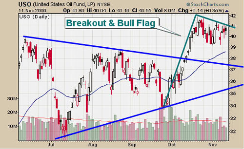 The USO oil fund broke out a few weeks ago from the large pennant pattern. The price has been flagging for about 3 weeks now. It looks like we are getting close to a low risk setup so I am keeping a close eye on this fund.