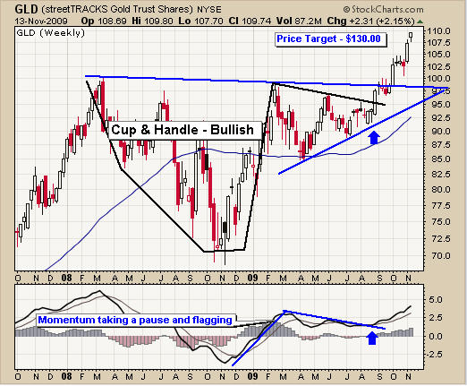 We can see that over the past two years GLD has formed a large cup & handle pattern which is very bullish. A breakout above the handle will trigger investors to buy gold as a long term investment and that is what we are seeing now.