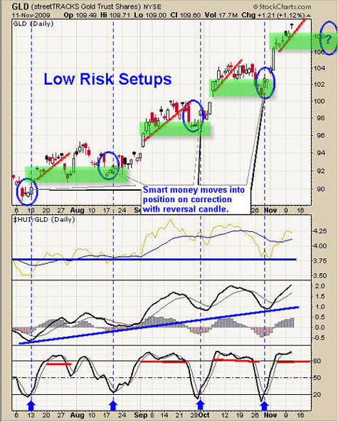 Using GLD as an example, the trend has been up for several months on the weekly chart. So we know buying low and selling high is the proper strategy for this investment. The weekly chart above shows this.
