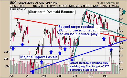 USO fund had a very nice pullback in early December and I pointed out a spec play at $35.50 with targets set at $37, $38 and $40. So far the first two profit taking targets have been reached.
