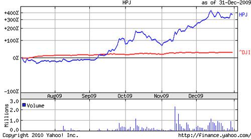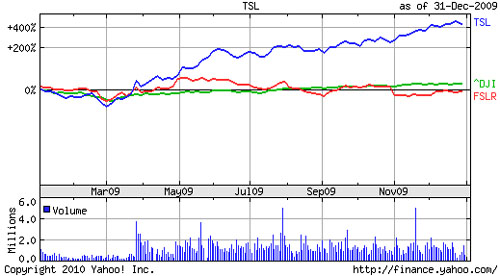Just look how Trina Solar (NYSE: TSL) fared in 2009 compared to the Dow Jones and U.S.-based First Solar (NASDAQ: FSLR):