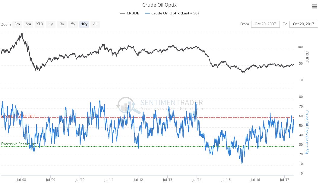 The Crude Oil optix or optimism index is likewise quite bearish, although it too is not at wild extremes, but both this and the Hedgers chart suggest that oil is more likely to drop over the short to medium term than rally, which fits with what the other technical factors observed above are pointing to.