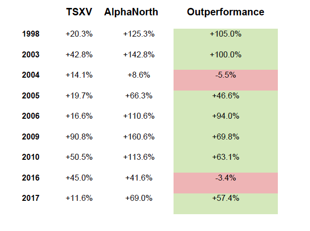 AlphaNorth disclosures: Data prior to 2009 used the BMO Small-Cap Index and institutional small-cap pooled fund managed by Steve Palmer and Joey Javier. 2009 and subsequent data uses TSX.V and AlphaNorth Partners Fund returns. The information contained in this document is not a solicitation to sell any investment products offered by AlphaNorth Asset Management. The information contained herein is for discussion purposes only. Please refer to the Offering Memorandum for complete details of any investment products offered by AlphaNorth Asset Management. There is no guarantee of performance and past performance is not indicative of future results. Returns are presented for Class A shares on an annualized basis except where noted and stated net of all fees. The inception date is December 1, 2007, for the fund. Returns prior to 2007 are based on growth of investment in institutional small cap pooled fund from inception August 1, 1998, to August 1, 2007, and growth of investment in AlphaNorth Partners Fund Inc. from inception December 1, 2007, to the current NAV.