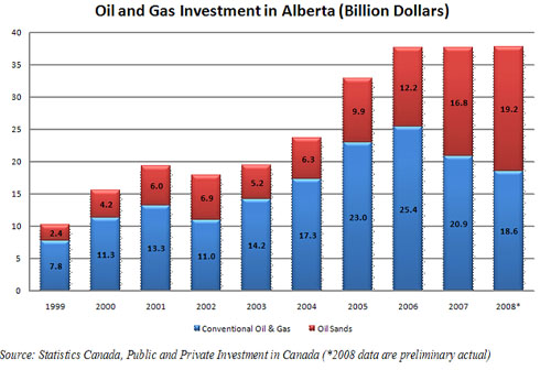 This chart from Statistics Canada tells an interesting tale. In 2008, investment in Alberta's oil sands reached a record high of $19.2 billion, a 14% increase over 2007, even after oil prices fell below $34 per barrel. Now that prices are close to $80, development and research will only increase in this proven and reliable resource.