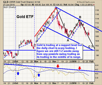 Gold has been under selling pressure since early December. That powerful drop and the chart pattern it has formed will generally resolves itself after an ABC retrace pattern. I have drawn this on the chart which is what I think will happen in the near term. This daily chart of GLD ETF has a small 4 day bear flag and bearish reversal candle which is pointing to lower prices in the near term.