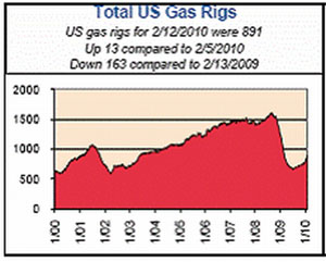 The combined oil and gas rig count finally exceeded the prior-year level, now up by 7 from the same period in 2009. It rose to a 22-year high in 2008, peaking at 2,031 in the weeks ended Aug. 29 and Sept. 12.