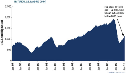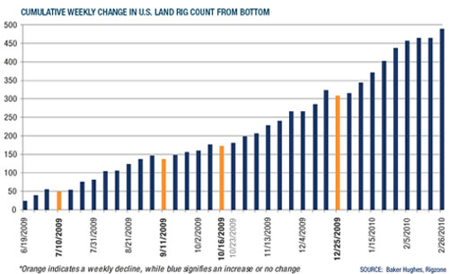 The rig count rise is impressive and the recovery is developing in a V-shaped pattern. Since the bottom, the industry has added an average of 13 rigs per week, and the best one-week gain came in late-December when 38 rigs went back to work. According to data quoted by RigZone, there were 1,313 land rigs working in the U.S. as of late-February, which is 60% above the June 2009 bottom but still 32% below the August 2008 peak.