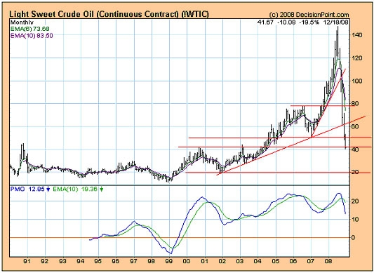 From Trader Tracks (12/19/08): "OPEC and others announced production cuts to remove excess inventory from the crude oil markets. After finding lower support near $40, oil snapped back to $50 and retreated again. OPEC has national spending budgets based upon oil at $75-$85 per barrel and are only earning half of that. Further, when paid in US sinking dollars they are losing even more on currency trading. They never like to curtail production, especially during times of overspending, but some cutback must be implemented now.