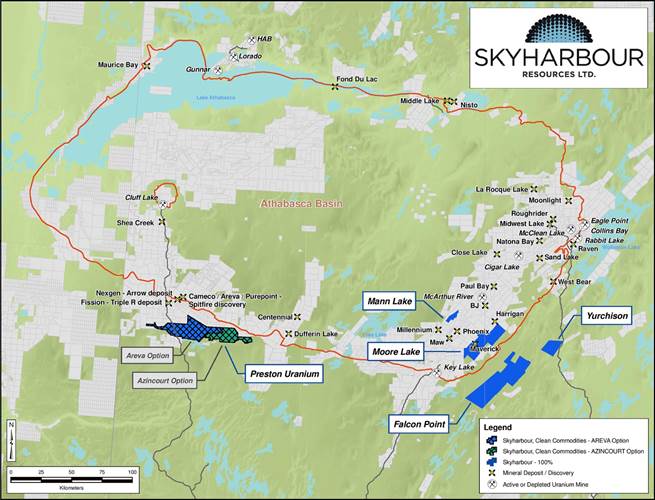 At the same time, Skyharbour agreed with Azincourt Uranium to option 70% of another portion of Preston, with Azincourt issuing 4.5 million shares and spending $3.5 million over three years, to Skyharbour and Clean Commodities. The two agreements in total mean that for $11.5 million in exploration and cash payments plus 4.5 million Azincourt shares, 70% of the Preston and East Preston projects will be optioned off.