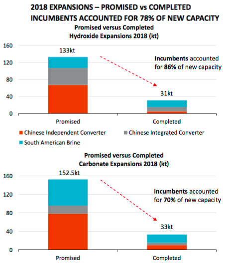 In the chart below we see a review done by Orocobre of 2018's expectations vs. reality, a combined 78% shortfall in hydroxide and carbonate expansions. 285.5K tonnes of new supply expected, 64K tonnes delivered. We see this year after year after year. . .when will the market catch on? This can only be good news for lithium pricing going forward.