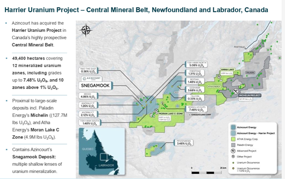 While Azincourt controls multiple uranium assets, the project most likely to move the shares in the near to medium term is the Harrier Project, which includes the Snegamook Uranium Deposit in Labrador's Central Mineral Belt.
