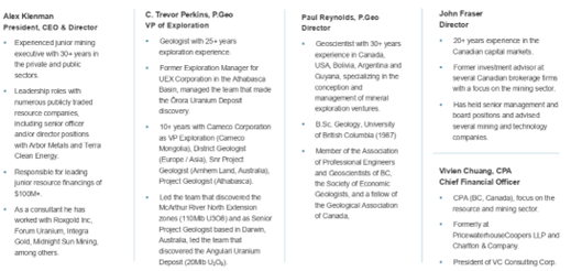 The technical strength of the company is anchored by C. Trevor Perkins, P.Geo., Vice President of Exploration, who brings more than 25 years of global uranium experience. His background includes senior exploration roles at UEX Corporation and Cameco, where he was part of teams responsible for major discoveries such as the McArthur River North Extension and the Angulari uranium deposit. This is a team with direct experience discovering and advancing uranium systems, not one learning the commodity for the first time.