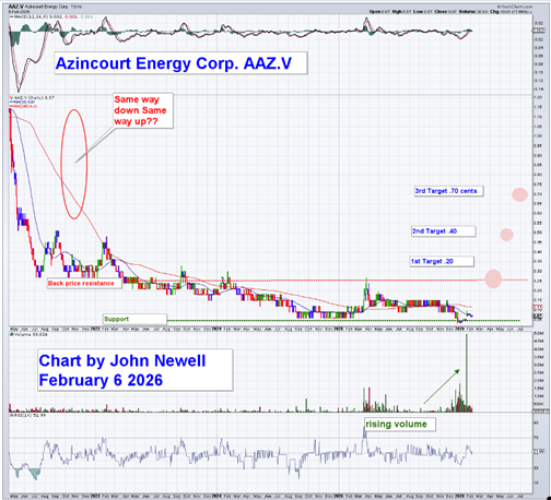 From a technical perspective, the chart for Azincourt Energy Corp. shows the characteristics of a long basing pattern following a prolonged bear-market decline. Price action has compressed near the lows, suggesting that sustained selling pressure has largely been exhausted and that the market is beginning to stabilize.