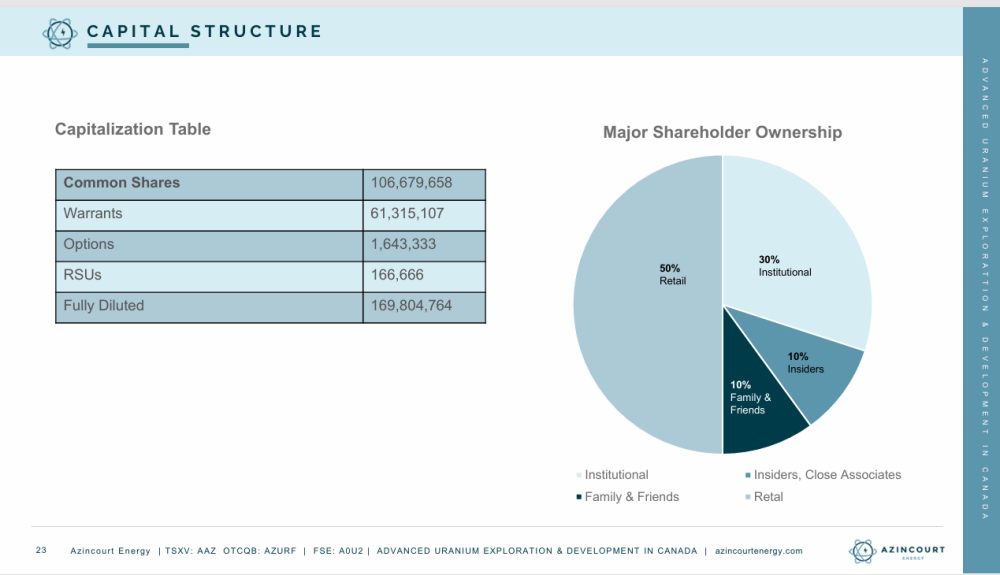 The company has approximately 106 million shares outstanding and roughly 169 million shares fully diluted, including warrants, options, and RSUs. At current prices, the market capitalization remains modest relative to the quality, scale, and jurisdictional strength of its uranium assets.