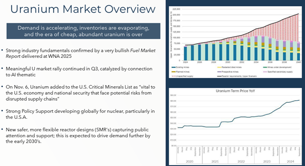The uranium market's structural supply gap is becoming increasingly visible. Developers with permitted, scalable projects inside energy-secure jurisdictions are positioned to benefit disproportionately if utilities accelerate contracting or if government-backed strategic procurement expands.