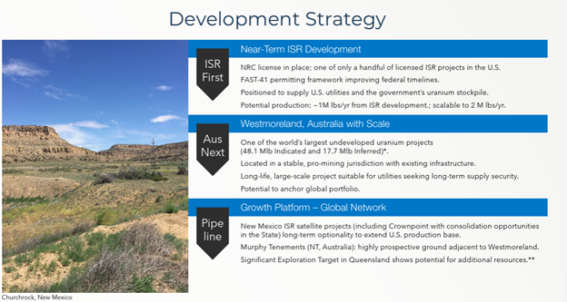 Near-term emphasis remains on ISR development in New Mexico. The combination of NRC licensing, FAST-41 framework inclusion, and U.S. policy support for domestic uranium production gives the project strategic relevance beyond its standalone economics.