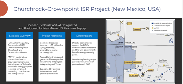 Production from Churchrock is referenced as scalable from approximately 1 million pounds per year, with expansion potential. In an environment where utilities are increasingly focused on contract security, having permitted ISR capacity inside the United States carries weight.