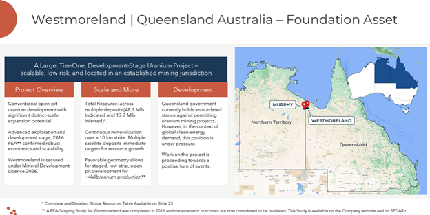 In Australia, Laramide controls Westmoreland in Queensland, one of the largest undeveloped uranium projects globally. The current resource base includes 48.1 million pounds Indicated and 17.7 million pounds Inferred, positioning the asset as a potential long-life, large-scale supply source once policy alignment is achieved.