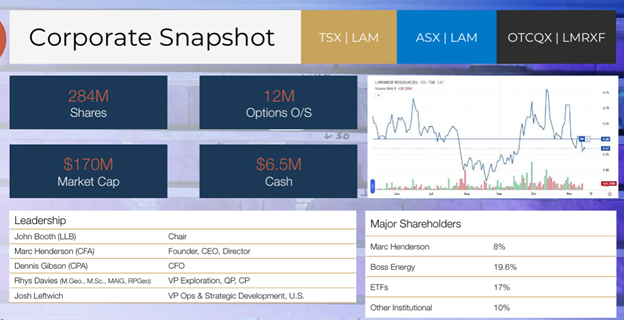 As of the January 2026 corporate presentation, Laramide reports approximately 284 million shares outstanding and 12 million options outstanding, with roughly CA$6.5 million in cash and a market capitalization near CA $170 million at the time of disclosure.