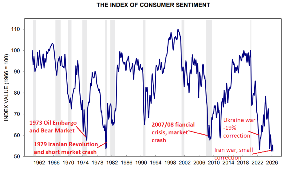 There are real reasons that consumer confidence plunges like this, I mean, reality. The Ukraine war did not cause lower oil production; it was only a risk that caused oil prices to rise, causing an inflation problem. Consumers had it right, and the markets barely escaped a bear market.