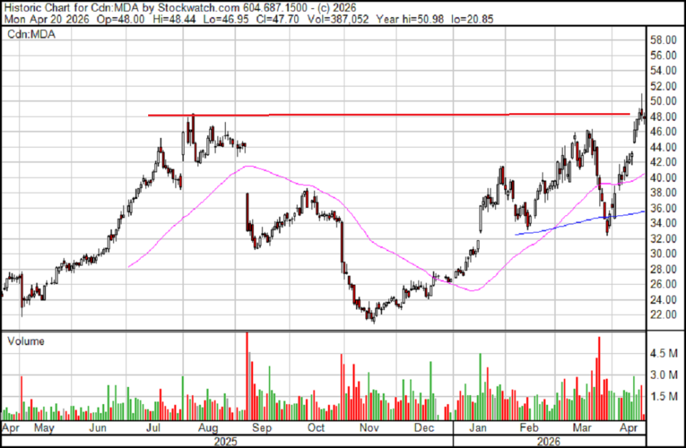 MDA Space Ltd.'s (MDA:TSX; MDA:NYSE) stock went to new highs and looked like a major breakout would happen, but the stock eased back.