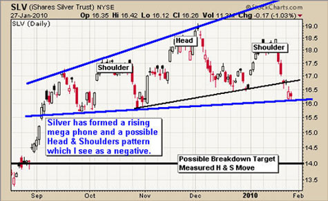 Silver has a funky looking chart. It has formed a large megaphone pattern and possible head & shoulders pattern. Both are bearish and if we use the Head & Shoulders to calculate where silver could end up trading if it continues to break down, then $14.00 would be a level to look for a bounce.