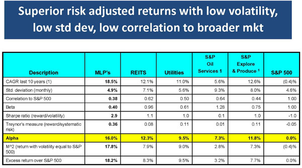The standard deviation for MLPs is lower at 4.9%; REITs, 7.1%; utilities, 5.6%. The correlation to the S&P 500 is also lower so it provides a better diversification benefit. It's 0.38 for MLPs against 0.625 for utilities. The beta is also lower. It's only 0.4 times; REITs are close to the market; utilities, 0.6 times. The reward to volatility, the sharp ratio, is significantly higher. The reward to systemic risk is also significantly higher. Then when we calculate the alpha it's significantly higher. We're calculating a 16% alpha for the MLPs sector; 12.3% for REITs; and 9.5% for utilities. If you make the volatility equal to the S&P 500, the outperformance is even more dramatic. The excess return over the S&P 500 is huge. For all those reasons, we think MLPs remain a pretty compelling asset class for investors to consider.