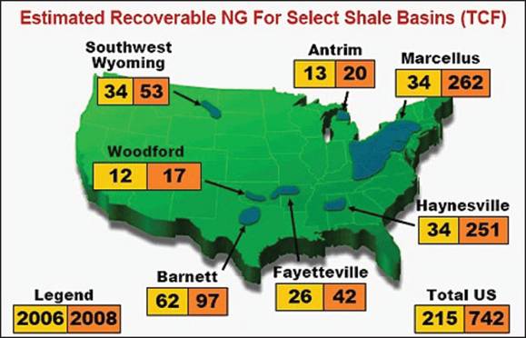Figure 1. Major shale areas or formations in the U.S. and the estimated recoverable natural gas in 2006 and 2008. Modified from Daily Oil Bulletin (May 4, 2009).