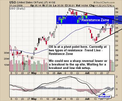 Crude oil is currently trading at resistance. We could see a sharp move lower again or a sharp breakout to the up side. We continue to wait for a breakout and low risk setup in oil.