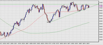 Play the range. Simply try to buy near $68, sell near $74, with stop losses not far from these levels to minimize losses if the reversal doesn't occur. If that's the case, use this as a signal to jump in and play the other direction.