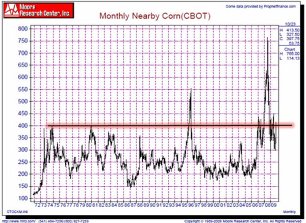 A great example of how a long term perspective can influence an investment or trading decision can be seen in the Corn chart below courtesy of Moore Research, Inc. www.mrci.com/pdf/c.pdf.