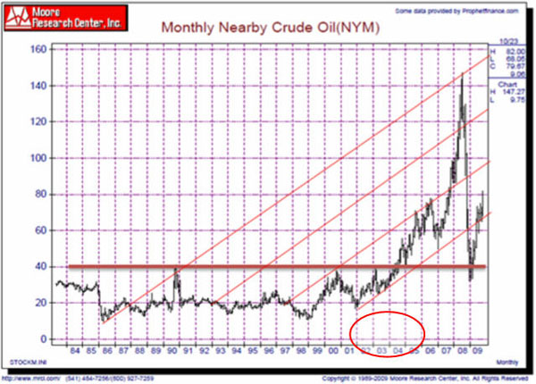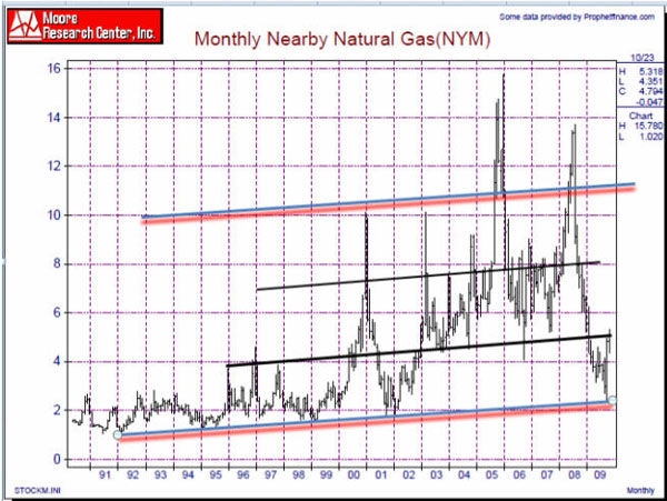 During the month of September, Natural Gas made a major low and a spike to the $5 dollar area brings us to the first trend line on the price chart. We see that beyond this area, the $8 dollar area is the next trend line that price projects. For those of you watching the Natural Gas market, think of how more confident you might have been in purchasing a Natural Gas investment had you seen where price was on the long term chart. But if you look closely at the chart, you will see that every time we have ever hit this trend line, price has always BOUNCED off it twice. In 94-95 there was a double bounce. The 98-99 low had a double bounce and finally the 01-02 had a double bounce. If history is any guide, the odds suggest we will get a retest of this area once in 2010 and a long term low will probably be established. Armed with this knowledge, the next time Natural Gas gets anywhere below the $3 dollar level, buy with both arms.