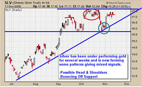 Silver has been under performing gold for several weeks now. I think this is because gold is the safe haven of choice for traders and investors. That being said silver generally leads gold so this is giving me a red flag. A larger correction in precious metal ETF prices could be just around the corner. But until we see a technical breakdown on the charts we are staying long.