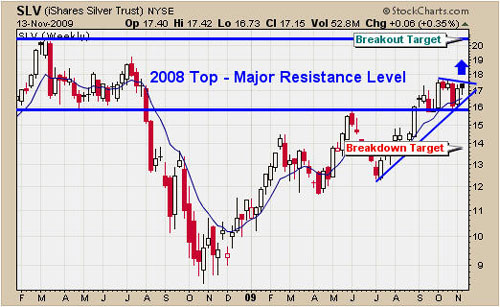 SLV has yet to breakout above the 2008 high. But the chart is still very strong. If we see the price move above the $17.50 level I expect buyers are going to jump in and push prices up to the $20 level.