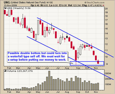 UNG continues to trend down and underperform the market. The last time UNG dropped to this level we had a nice bounce generating a 30% move in 3 weeks. But I don't think that will happen this time. The price has been sliding lower slowly on light volume. This type of price action is not as predictable when compared to others. I will wait for a proper setup before buying an oversold bounce or shorting after a bounce.