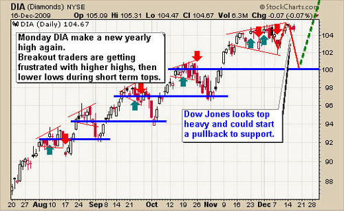 The DIA fund has performed just the way I thought it would. Push to a new high then sell down. Generally I would expect this move down to test my support level or trade near that level, but because we are heading into the holiday season and volume is light the market has a natural tendency to drift higher. I'm sure this is why it's still trading near the high.