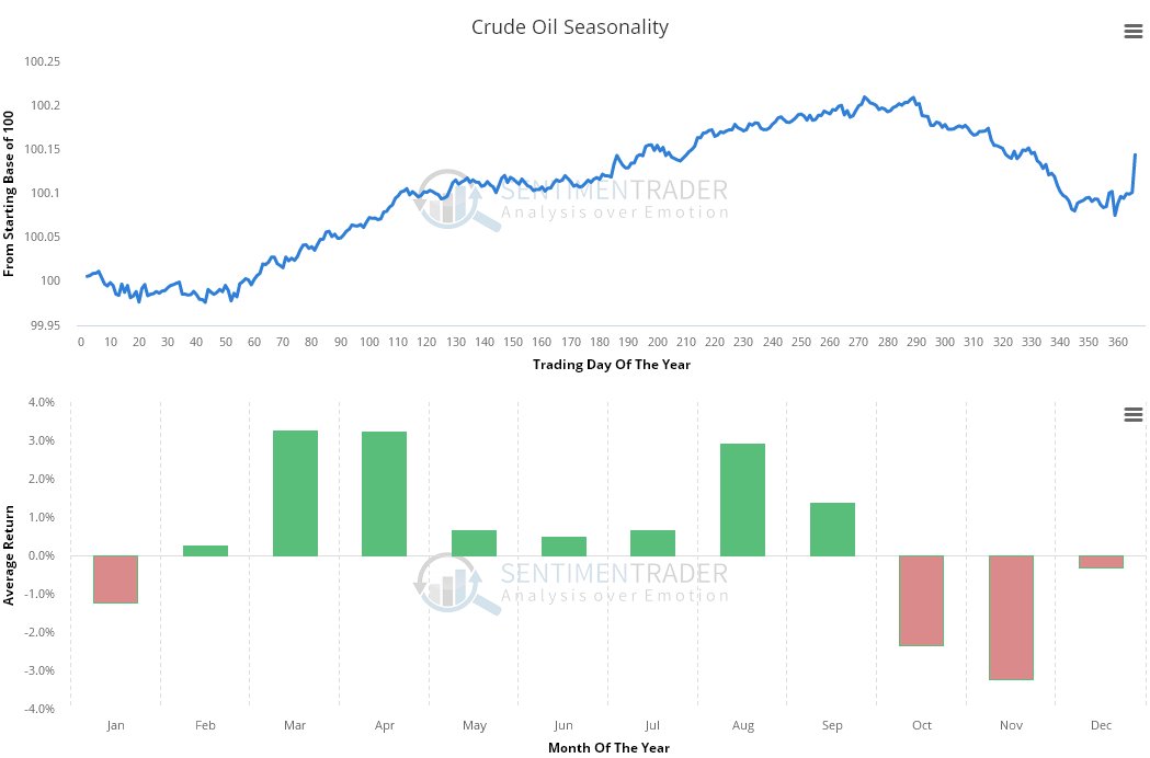 It is thus interesting to observe, in addition, that we are now entering the most bearish time of year seasonally for oil, although this of course is a background influence that can be overridden by other factors.