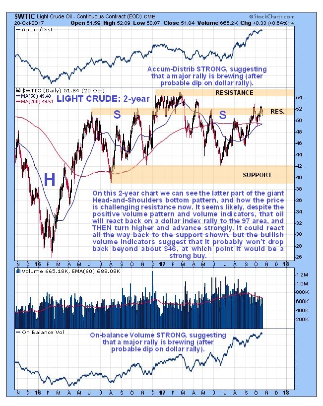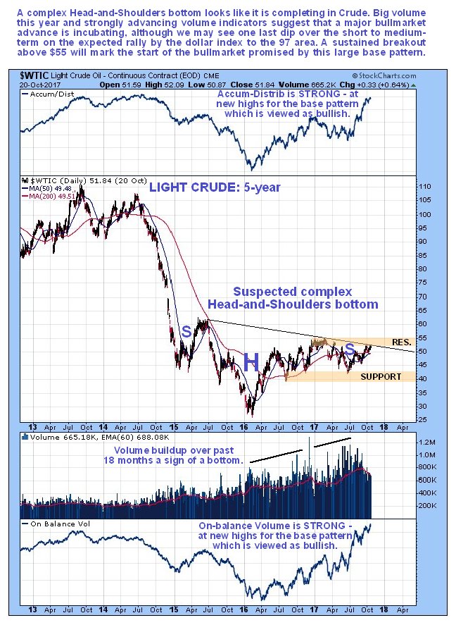 On the 5-year chart for Light Crude we can see that a giant complex Head-and-Shoulders bottom pattern has formed which looks very close to being completed. It is labeled complex because the right part of it is drawn out with multiple "Shoulders." An important bullish factor that strongly suggests that the base pattern is genuine and will resolve into a major bull market is the big buildup in volume over the past two years, in particular this year, especially because most of this is upside volume which has driven both volume indicators shown much higher, with the Accum-Distrib line close to new highs, and On-balance Volume at new highs. Breakout from the entire base pattern will be signaled by the price breaking above the resistance level related to the tight congestion zone that formed early in the year, i.e., by the price breaking above $55. It is close to achieving this, and while we can't rule out that it will happen very soon, it is thought more likely that we will see a mild reaction as the dollar advances towards its target in the 97 area, and THEN oil turns up and breaks out of the base pattern.