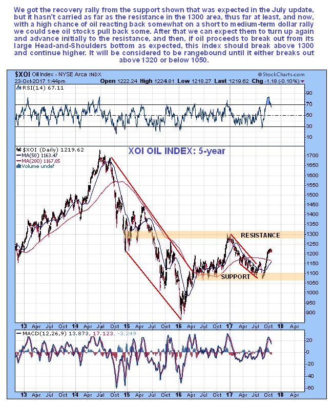 Turning now to oil stocks, we see on the 5-year chart for the XOI oil index how it turned higher as predicted in the July update and has staged a significant rally. We thought that it might get as high as the resistance in the 1300 area on this run, but now it looks like it will first react back before continuing on to the 1300 area, due to a minor reaction back by oil over the short to medium-term as the dollar advances to its target. Once Light Crude itself breaks out of its Head-and-Shoulders bottom by breaking above the key $55 level, then of course the XOI oil index should vault above the resistance in the 1300 area, which would break it out of the large trading range it has been stuck in for about 18 months, bounded by approximately 1070 on the downside and 1300 on the upside.