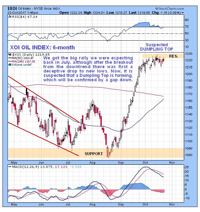 On the latest 6-month chart for the XOI oil index we can see how the July breakout out of the downtrend in force from the start of the year was followed by a deceptive drop to new lows, before a steep orderly uptrend followed that ran out of steam at the end of last month, with the price then rounding over into what is suspected to be a "Dumpling Top." This suspected intermediate top pattern will be confirmed by a gap down move on the right of it to complete it, which should occur as a result of oil dropping back some in response to the dollar rallying.