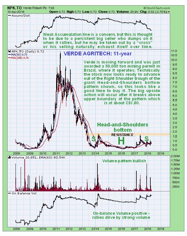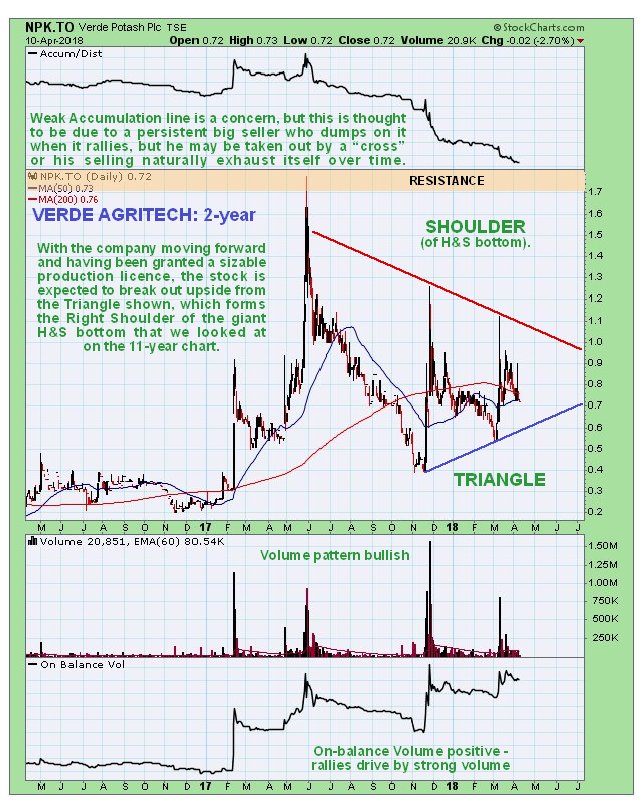 Conclusion: Verde Agritech is rated a buy here, for a breakout from its Triangle leading initially to a challenge of the resistance at the upper boundary of the H&S bottom pattern at about C$1.80. Buyers should be aware that there is some (lesser) chance that it will first drop back to the support at the lower boundary of the Triangle now at about C$0.60. Long-term, once it has broken out of the base pattern, a major bull market will be in prospect. Verde Agritech trades in light volumes on the US OTC market, where for this reason it should be avoided for now. There are 37.3 million shares in issue, which is modest.