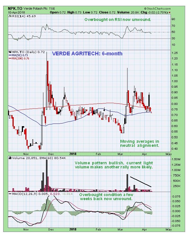 Verde Agritech Plc, NPK.TSX, AMHPF on OTC, closed at C$0.72, $0.567 on 10th April 2018.