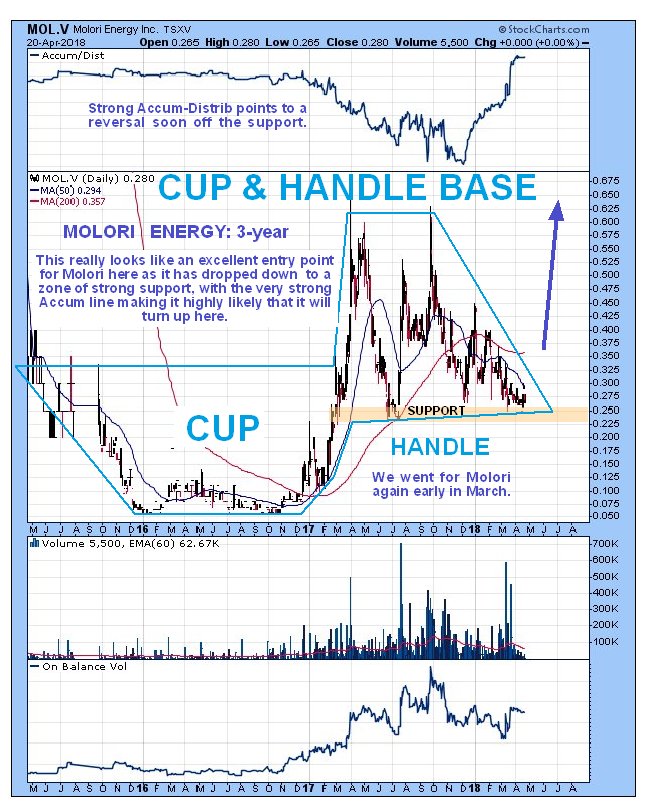 Molori Energy Inc MOL.V, MOLOF on OTC, closed at C$0.28, $0.22 on 20th April 2018.