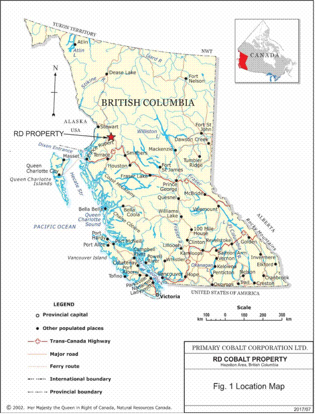 RD Cobalt Property, 100% option, 7,327 hectares, NW B.C. South of Hazelton