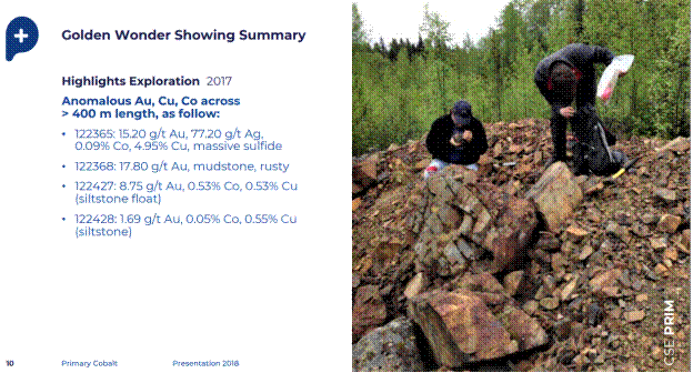 As mentioned above, cobalt is mined as a byproduct of mostly nickel and copper. The Golden Wonder showing gives us a clue that this will be a copper/gold system with some good cobalt numbers. This is just one of several zones reporting anomalous copper, gold and cobalt. The outcrop appears to be several meters thick with potential strike of 400 meters. Gold samples ran as high as 17.8 g/y and cobalt up to 0.53%.