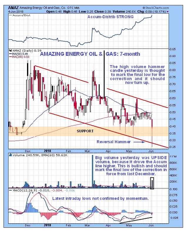 The 18-month chart is very useful as it enables us to grasp the big picture of what is going on with this stock. It reveals that the correction in force from last December is actually the Handle of a large Pan & Handle base pattern. With June 4th's action indicating that the Handle of the pattern is at last complete, it should now proceed to turn up and break out upside in due course from the entire pattern into a bull market. While Amazing won't necessarily require a rising oil price to achieve this, its charts do suggest that the oil price will at least hold up and possibly continue to advance further, and right now oil is oversold after its recent drop and set to at least stage a bounce, which should help Amazing.